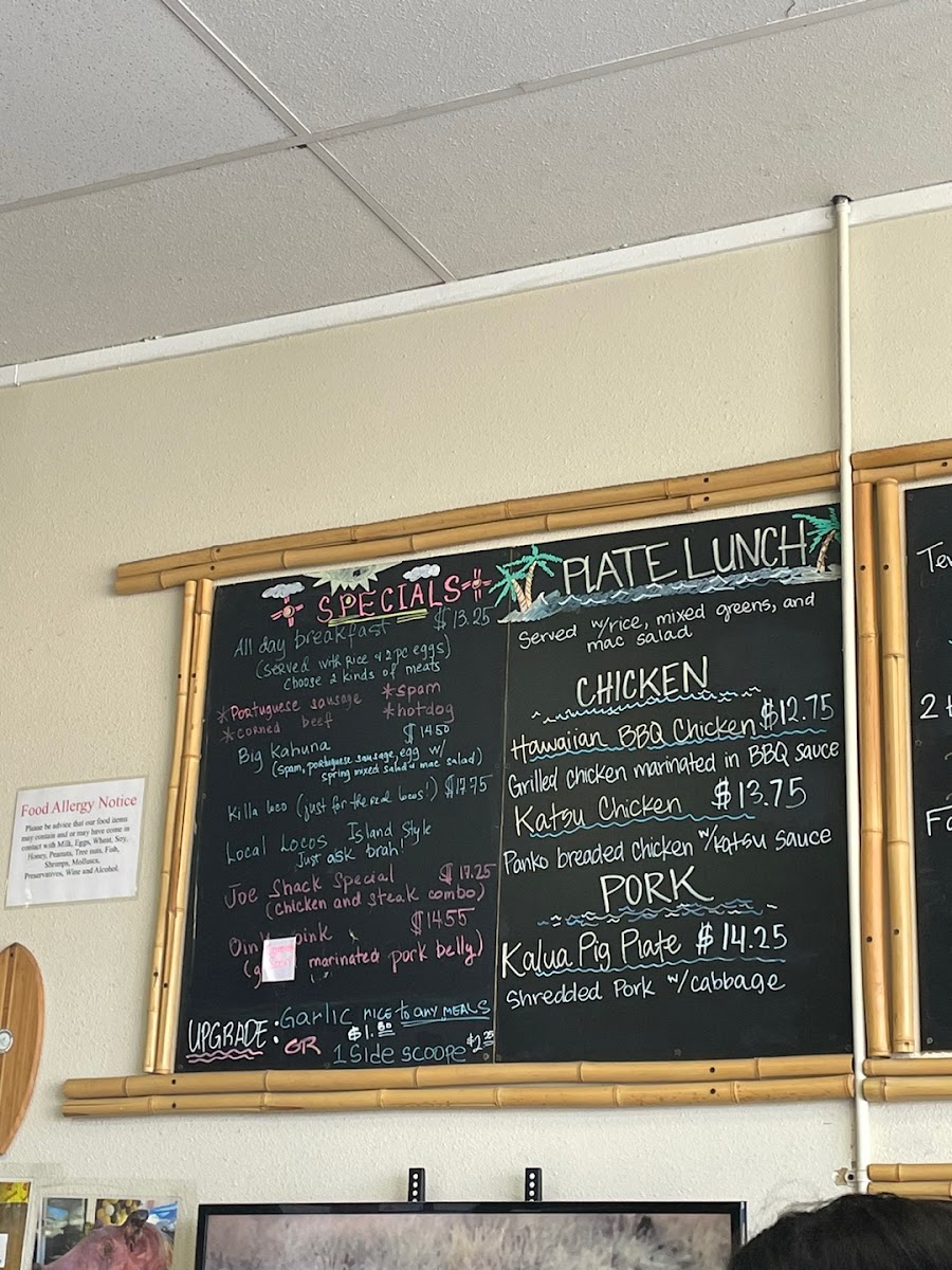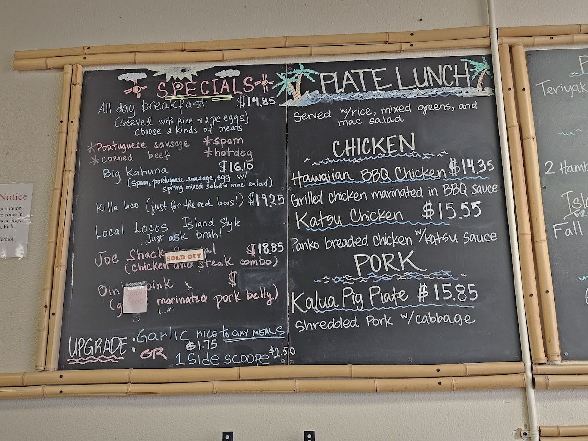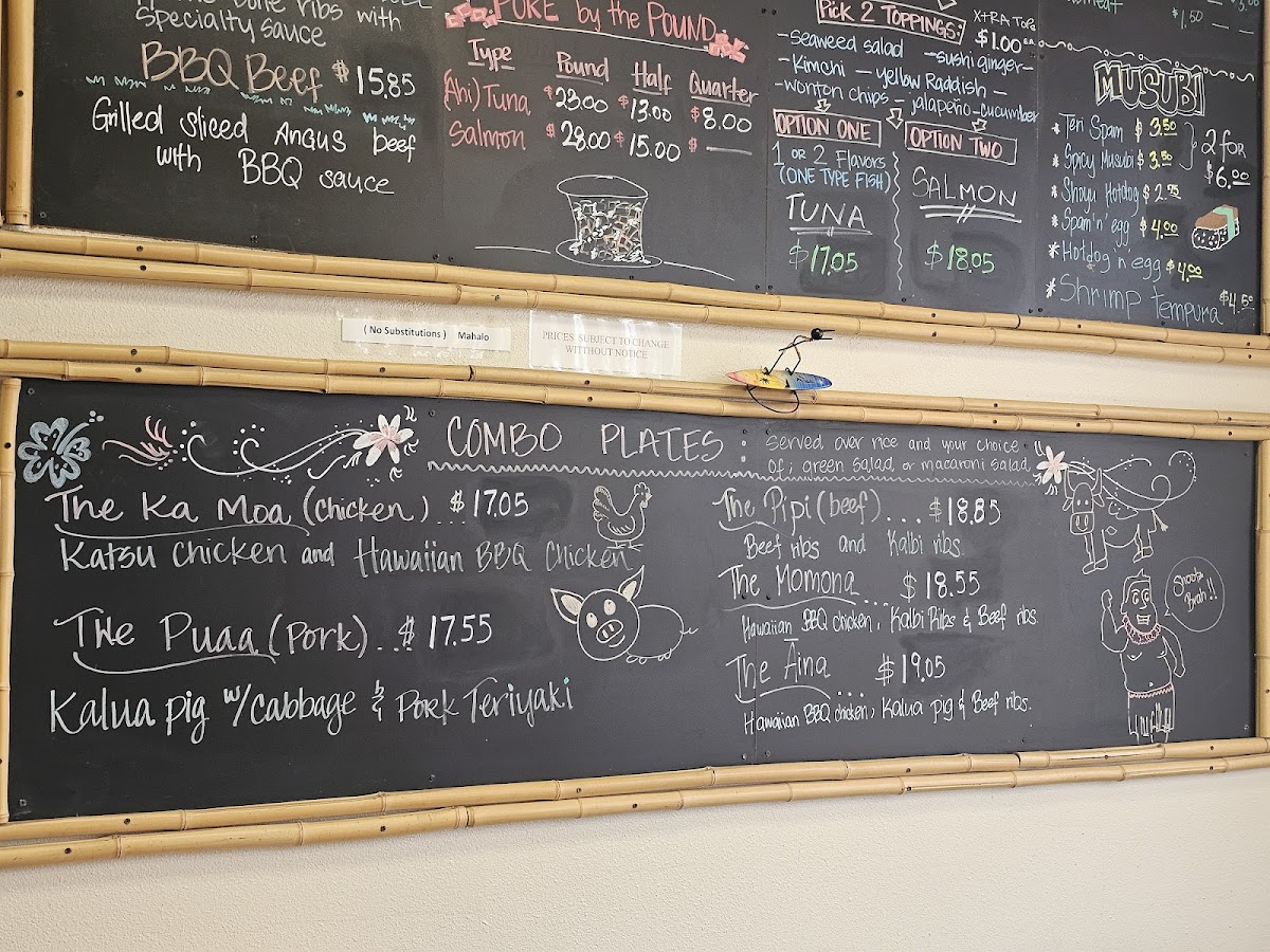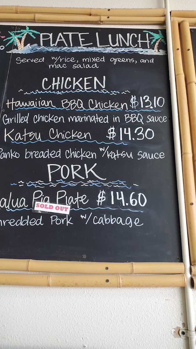 Hawaiian BBQ chicken, kalbi ribs and beef ribs.